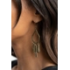 Hammered in antiqued detail, flared rectangular frames swing from the bottom of a geometric brass frame for a rustic flair. Earring attaches to a standard fishhook fitting.