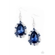 Featuring round, teardrop, and oval shapes, blue and white rhinestone encrusted filigree borders a dramatically oversized blue rhinestone teardrop for a jaw-dropping dazzle. Earring attaches to a standard fishhook fitting.
