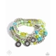Infused along elastic stretchy bands, silver horizontal fittings, Green Ash, leek green, turquoise, Apple Green, and silver beads stack up the wrist for a free-spirited pattern. Textured silver discs are sporadically infused along the strands for additional eye-catching detail. As the stone elements in this piece are natural, some color variation is normal.