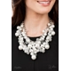 An elegantly effervescent collection of oversized pearls, glassy crystal-like beads, and white rhinestone studded silver ornaments effortlessly clusters along two bold silver chains below the collar. The bubbly bunched accents glamorously gather into a brilliantly boisterous fringe for an uproarious uptown fashion. Features an adjustable clasp closure.