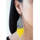 Strands of gray, black, white, and yellow seed beads vivaciously weave into a checkered beaded fringe. Earring attaches to a standard fishhook fitting.