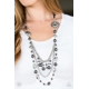 A silky black ribbon replaces a traditional chain to create a timeless look. Pearly dark gray beads and funky silver pieces intermix with varying lengths of silver chains to give a fresh take on a Victorian-inspired piece.