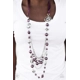 A silky purple ribbon replaces a traditional chain to create a timeless look. Pearly deep purple beads and funky silver pieces intermix with varying lengths of silver chains to give a fresh take on a Victorian-inspired piece.