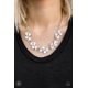 A row of dazzling white rhinestones drapes along the neckline, creating a sparkling display. Daintier white rhinestones are sprinkled along the clusters, adding luminous detail to the timeless design. Features an adjustable clasp closure.