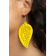 Painted in a sunny yellow finish, a wooden frame is delicately cut into an airy leaf pattern for a seasonal flair. Earring attaches to a standard fishhook fitting.