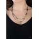 A collection of silver, gold, and gunmetal square rods slide along two dainty silver chains below the collar, creating edgy metallic layers. Features an adjustable clasp closure.