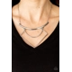 A bowing silver bar links with an abstract angled frame at the bottom of a dainty silver chain, creating an airy geometrical plate below the collar. Features an adjustable clasp closure.