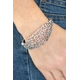 Glistening silver bars coalesce into an airy stenciled cuff-like bracelet around the wrist for a whimsical metallic look. Features a hinged closure.