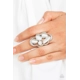Dotted in sections of dainty white rhinestones, a studded silver ribbon waves around a collection of white cat's eye stones for a refined flair. Features a stretchy band for a flexible fit.