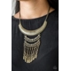 Stamped and embossed in tribal inspired patterns, three brass plates connect down the chest, creating a fiercely stacked pendant. Attached to twisted brass rods, ornate brass beads swing from the bottom of the lowermost plate, creating an eye-catching fringe. Features an adjustable clasp closure.