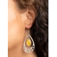 A dewy yellow cat's eye teardrop swings from the top of a shimmery silver teardrop frame that features whimsical floral filigree detail. Earring attaches to a standard fishhook fitting.