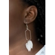 Curved white acrylic petals cluster at the bottom of an airy silver geometric frame, creating a whimsical lure. Earring attaches to a standard fishhook fitting.