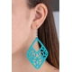 Brushed in a refreshing blue finish, wooden vine-like filigree climbs an airy kite-shaped frame for a seasonal vibe. Earring attaches to a standard fishhook fitting.