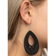 Painted in a neutral black finish, a wooden teardrop has been cut into a diamond and triangular stencil pattern for a tribal inspired flair. Earring attaches to a standard fishhook fitting.