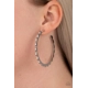 A flattened silver hoop is cut with a scalloped outer edge for a whimsical finish. Earring attaches to a standard post fitting. Hoop measures approximately 2 1/4" in diameter.