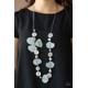 A colorful compilation of shell-like discs, mismatched gray acrylic beads, and petal-like gray leather pieces knot along strands of gray cording across the chest. The ruffled pieces of leather stack into a whimsical floral accent for a trendy finish. Features an adjustable clasp closure.