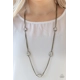 Glassy white teardrops attach to sections of antiqued brass chain across the chest, creating a refined display. Features an adjustable clasp closure.
