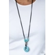 A refreshing turquoise stone disc is knotted in place at the bottom of shiny black cording decorated in matching turquoise stone and ornate silver beads, creating an earthy display below the collar. Features an adjustable sliding knot closure.