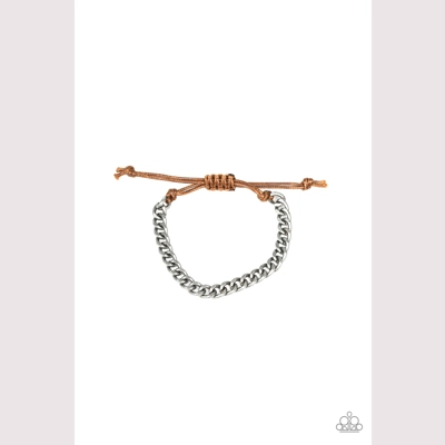 Shiny brown cording knots around the ends of a dainty silver beveled cable chain that is wrapped across the top of the wrist for a versatile look. Features an adjustable sliding knot closure.