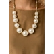 Separated by stacks of smooth and decorative gold rings, a collection of dramatically oversized white pearls are delicately hand-strung along an invisible wire that attaches to knotted strands of white cording for a classically handcrafted look. Features an adjustable clasp closure.