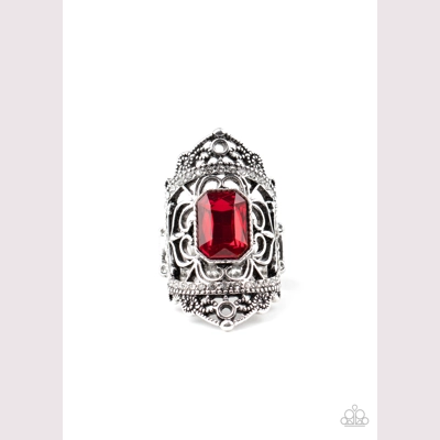 Infused with two bands of glittery white rhinestones, smooth and studded silver filigree branches out into a regal backdrop across the finger. Featuring an emerald style cut, a glittery red rhinestone embellishes the center for a royal finish. Features a stretchy band for a flexible fit.