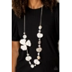 A colorful compilation of shell-like discs, mismatched white acrylic beads, and petal-like white leather pieces knot along strands of white cording across the chest. The ruffled pieces of leather stack into a whimsical floral accent for a trendy finish. Features an adjustable clasp closure.