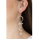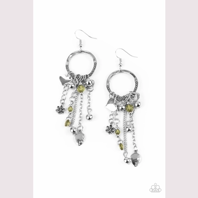 Featuring heart and floral shapes, a flirty collection of silver charms, glassy Military Green beads, and dainty silver chain links cascade from the bottom of a studded silver hoop, creating a whimsical fringe. Earring attaches to a standard fishhook fitting.
