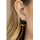 A dainty collection of black and brassy seed beads embellished the front of a circular frame, creating a colorful half and half pattern. Earring attaches to a standard post fitting.