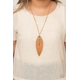 Pinched between a hammered gold fitting, a leaf shaped brown leather frame is spliced into feathery detail at the bottom of a lengthened gold chain for a free-spirited look. Features an adjustable clasp closure.