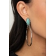 A shimmery silver hoop is threaded through the bottom fitting of an earthy turquoise stone dotted floral silver frame, creating a whimsical display. Earring attaches to a standard clip-on fitting.