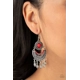 Dotted with a shiny red beaded center, a round silver frame gives way to an ornate silver crescent. Dainty silver beads swing from the bottom of the stacked frames, adding a whimsical fringe to the tribal inspired lure. Earring attaches to a standard fishhook fitting.