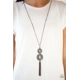 Delicately hammered in sections of shimmer, gunmetal circular frames stack into a bold pendant at the bottom of a lengthened gunmetal chain. A shimmery gunmetal tassel swings from the bottom of the stacked pendant for a casual finish. Features an adjustable clasp closure.