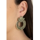 Studded and embossed in ornate textures and patterns, round and half moon brass frames stack into a tribal inspired lure for a trendy look. Earring attaches to a standard post fitting.