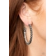 The front half of an ornately studded silver hoop is encrusted in smoky hematite rhinestones, adding a splash of exaggerated sparkle to the sassy display. Earring attaches to a standard post fitting. Hoop measures approximately 2" in diameter