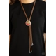 A trio of silver, red, and fuzzy cheetah print discs overlap into an adjustable pendant along rows of shiny brown cording for a wildly retro look.