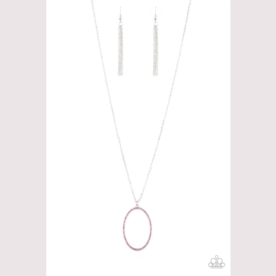 Encrusted in glassy pink rhinestones, an airy silver hoop swings from the bottom of a lengthened silver chain for a refined flair. Features an adjustable clasp closure.