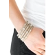 Dotted with glassy white rhinestones, a thick brown leather band has been spliced into five glittery strands around the wrist for a sassy look. Features an adjustable snap closure.