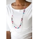 Pearly blue, pink, and purple beads and shimmery silver hoops trickle along glistening silver chains, creating mismatched layers down the chest. Features an adjustable clasp closure.