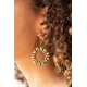 An explosion of round aurum rhinestones and aurum rhinestone dotted brass bars coalesce into a smoldering hoop. Earring attaches to a standard fishhook fitting.