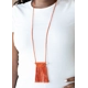 Orange cording delicately wraps around a dainty wooden dowel, knotting into a tasseled macrame centerpiece at the bottom of a dramatically lengthened display. Features an adjustable sliding knot closure.