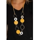 A shiny collection of mismatched silver rings and textured hoops link with round pieces of yellow leather across the chest for a whimsically earthy look. The colorfully rustic compilation attaches to layered strands of shiny yellow cording for a trendy finish. Features an adjustable clasp closure.