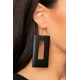 Brushed in a neutral black finish, a thick rectangular wooden frame swings from the ear for a retro look. Earring attaches to a standard fishhook fitting.