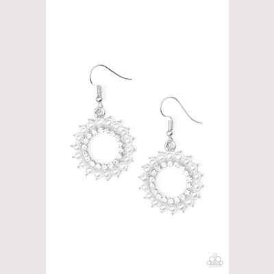 Dainty white pearls spin around a radiant white rhinestone center, coalescing into a refined hoop. Earring attaches to a standard fishhook fitting.