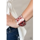A thick piece of Samba leather peeks out through a daisy stenciled silver cuff, creating a colorful centerpiece around the wrist.