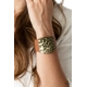 A hammered brass square-like frame gently curves with a thick brown leather band, creating a colorfully rustic centerpiece atop the wrist. Features an adjustable snap closure.