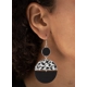 A black wooden crescent and hammered silver crescent link at the bottom of a round silver frame dotted with a black wooden center for an earthy flair. Earring attaches to a standard fishhook fitting.