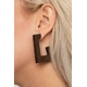 Brushed in a neutral brown finish, a distressed wooden frame curves around the ear, creating a rectangular hoop for a retro effect. Earring attaches to a standard post fitting. Hoop measures approximately 1" in diameter.
