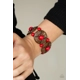 An oversized collection of red wooden beads and distressed brown wooden discs are threaded along stretchy bands that decoratively weave around the wrist for a summery flair.