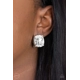 A dramatically oversized white gem is nestled atop a pronged silver frame, creating a jaw-dropping dazzle. Earring attaches to a standard clip-on fitting.