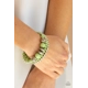 A whimsically mismatched collection of green stone beads, plain silver beads, and antiqued floral accents are threaded along stretchy bands around the wrist, creating colorful layers.